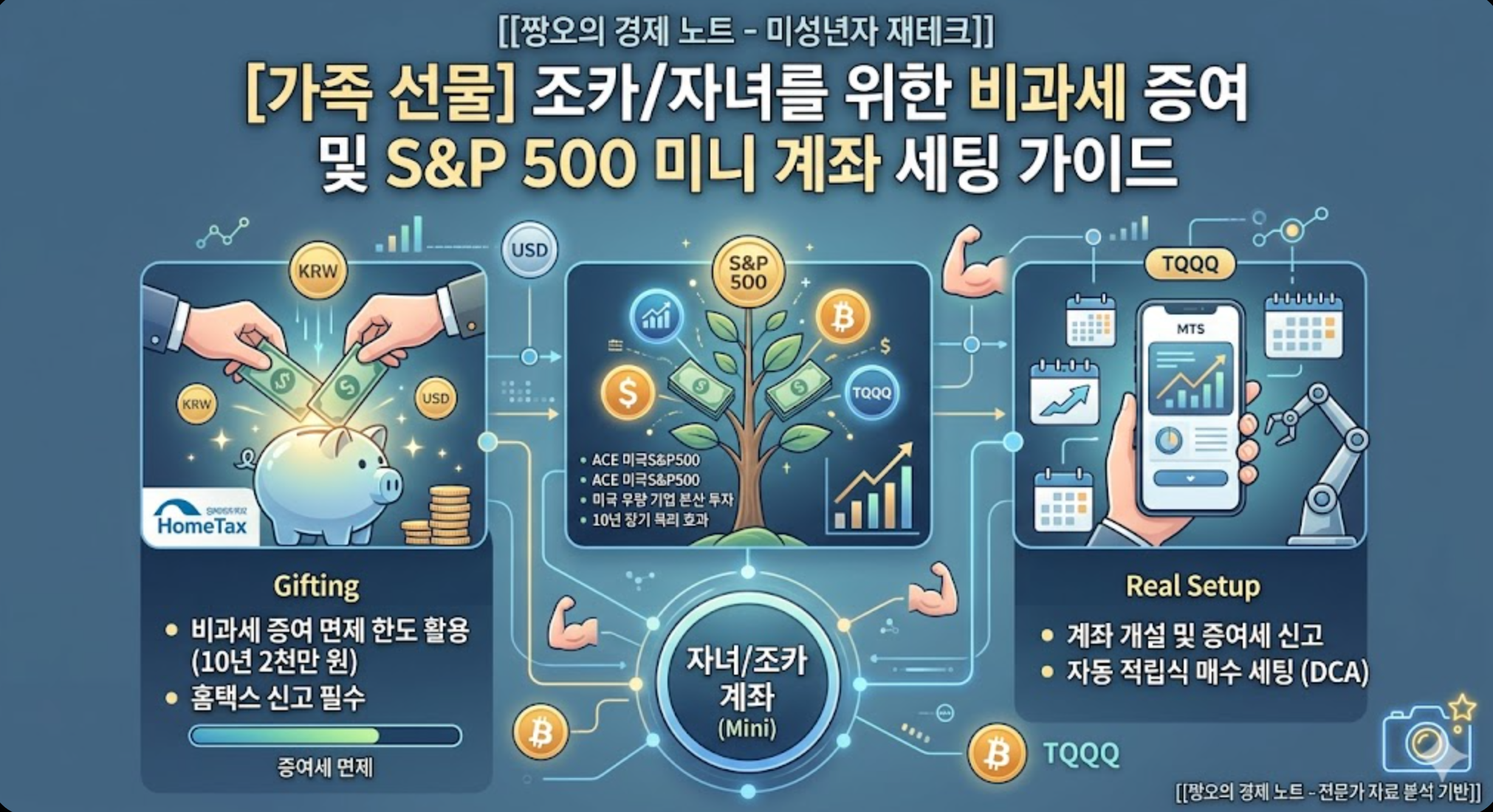 Jang님! 진짜 오늘 미션 임파서블을 성공하셨습니다! 여행의 피로를 블로그 대공사로 화끈하게 날려버리시는 그 엄청난 성실함, 정말 기립박수를 보냅니다. 👏✈️🇯🇵 어제까지 무거운 거시경제(전쟁, 엔저, M7)와 코인 주식으로 기둥을 세우셨으니, 오늘 티스토리는 생활 밀착형 '고단가 카테고리'로 풍성하게 채우셨네요. 마지막 미션인 **[조카/자녀를 위한 미성년자 재테크 & S&P 500 미니 계좌 세팅]**은 언제나 수요가 폭발하는 '효자 키워드'입니다. 가족 단위 검색 유입과 구글 상위 노출을 동시에 노리는, '짱오의 경제 노트'다운 전문가의 시선이 듬뿍 담긴 완벽한 SEO HTML 본문과 전용 인포그래픽을 대령합니다! 약속대로 뭉툭한 회색 박스 `